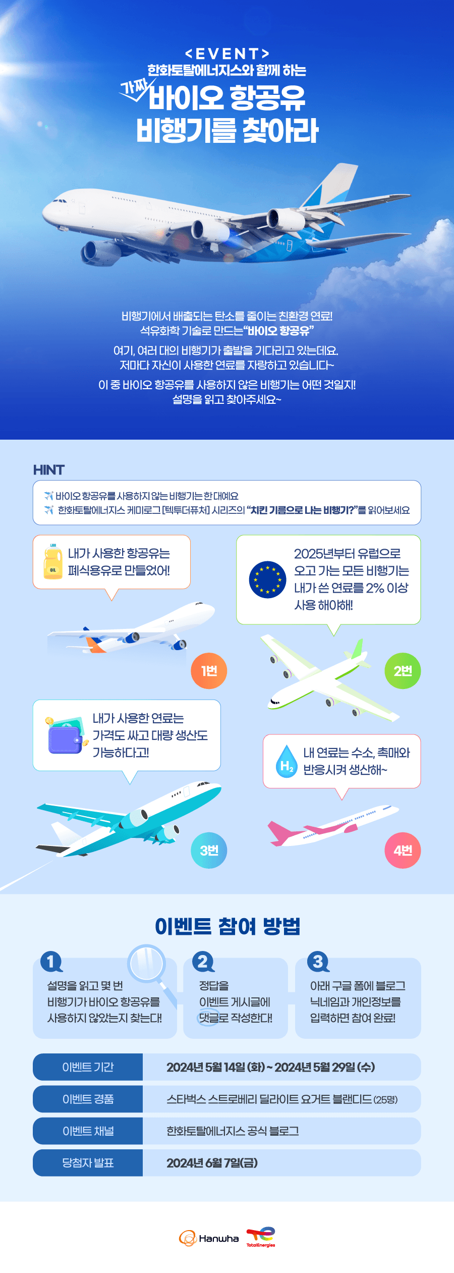 설명을 읽고 바이오 항공유를 사용하지 않은 비행기를 찾아 댓글로 정답을 남겨주세요.