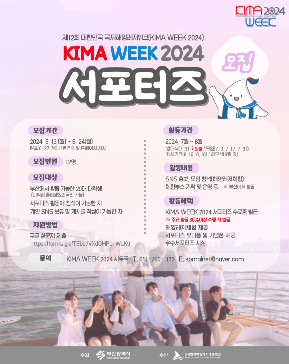 부산에서 진행되는 종합해양레저축제 제12회 대한민국 국제해양레저위크(KIMA WEEK 2024)에서 함께 해양레저의 즐거움을 알리고 축제를 함께 운영할 서포터즈를 모집합니다.
