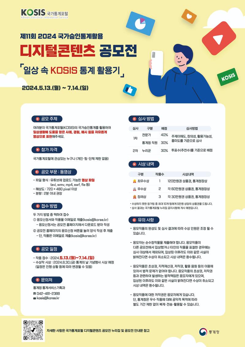 통계청에서는 통계에 대한 인식을 개선하기 위하여 이용자가 직접 경험한 통계 활용 사례를 공유하고자 「제11회 국가승인통계 활용 디지털콘텐츠 공모전」을 개최하오니 통계에 관심있는 분들의 많은 참여 바랍니다.