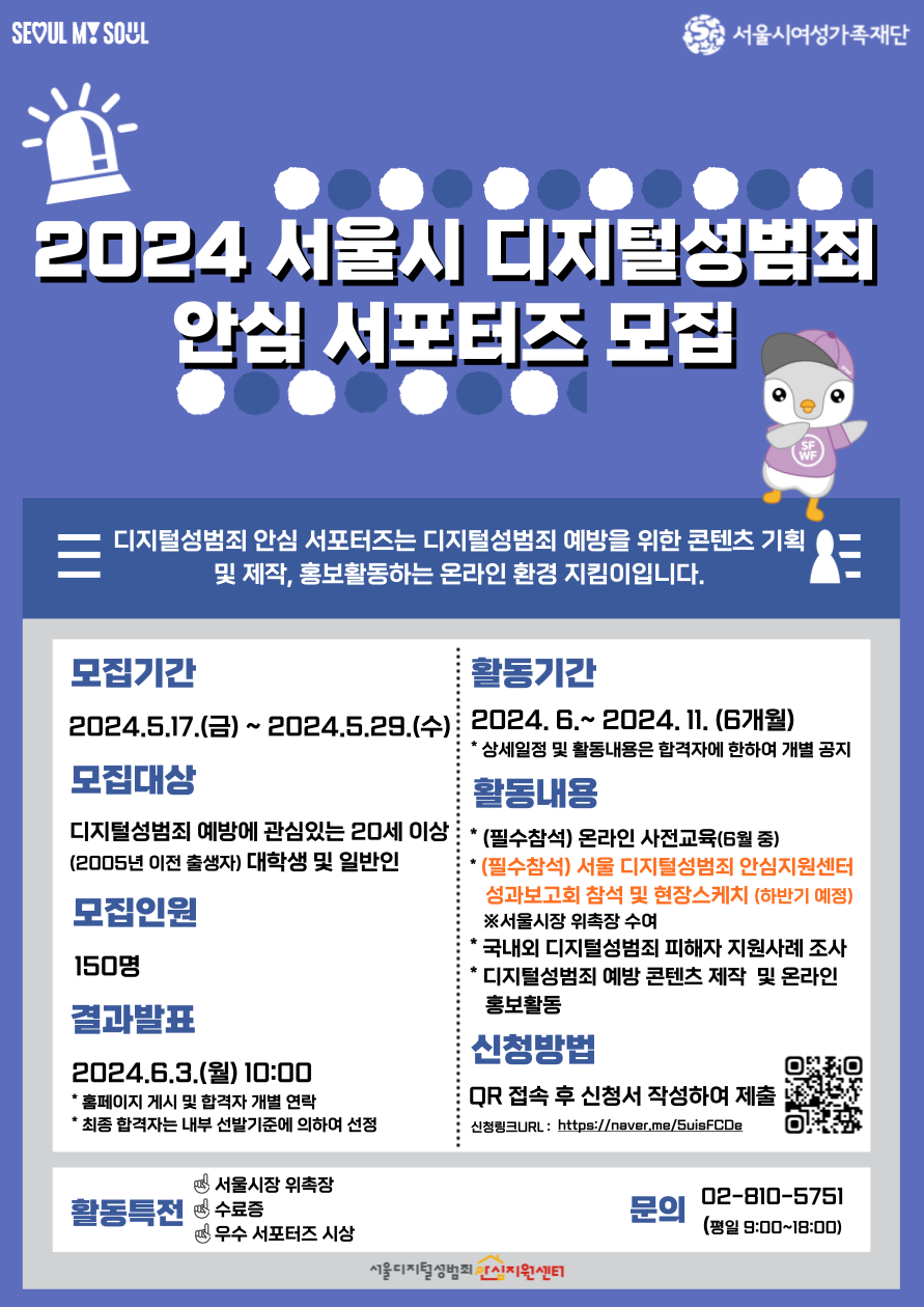 ◾활동내용: 온라인 사전교육(6월 중) / 서울 디지털성범죄 안심지원센터 성과보고회 참석 및 현장스케치(하반기예정) / 국내외 디지털성범죄 피해자 지원사례 조사 / 디지털성범죄 예방 콘텐츠 제작 및 온라인 홍보활동 등