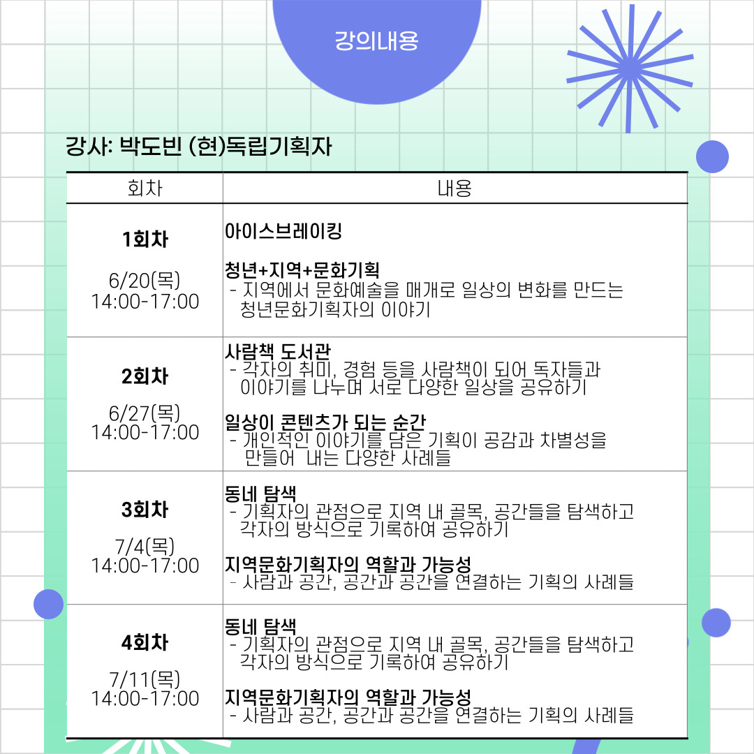 ▶강의일시 : 06.20.(목)~8.10.(토) 14:00~17:00 총 10회기 ★세부일정 커리큘럼 참고