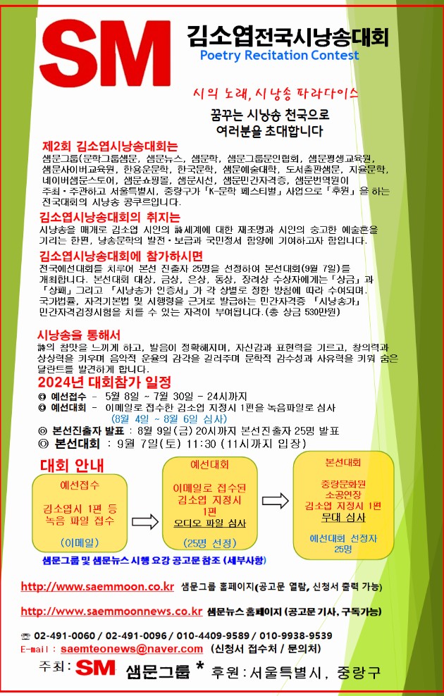 ☎ 010-4409-9589 (김소엽전국시낭송대회 행사 담당자 / 사무처)
