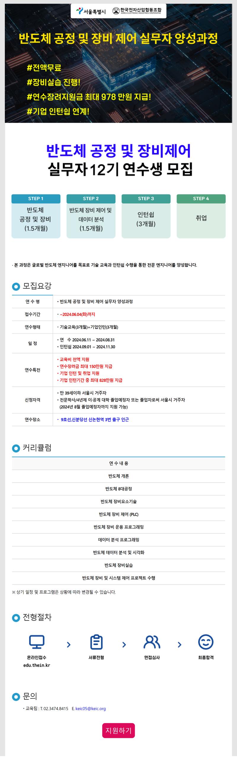 ● 접수 기간 : ~24.06.04(화) ● 연수 기간(직무연수 3개월+기업인턴 3개월) -직무연수 : 24.06.11~24.08.31 -인 턴 십 : 24.09.01~24.11.30