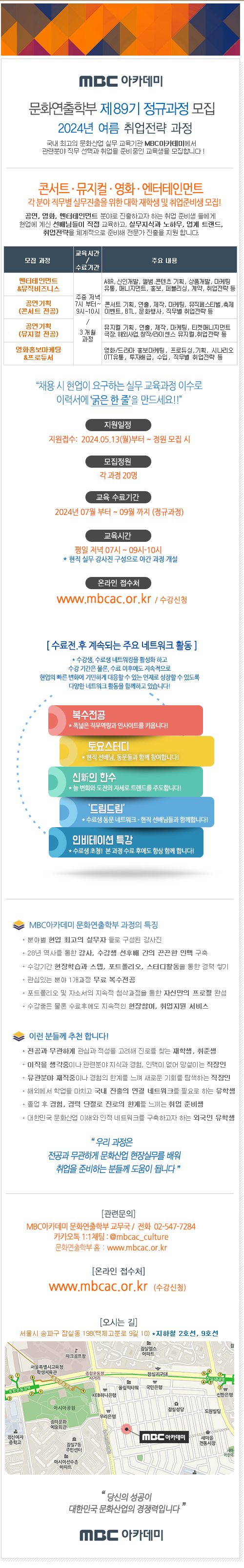 [MBC아카데미] 2024년 여름 '제89기' 문화산업 각 분야 비즈니스 직무 중심의 실무 멘토링 교육생을 모집하오니 '대학생, 취업 준비생' 여러분의 많은 지원 바랍니다!