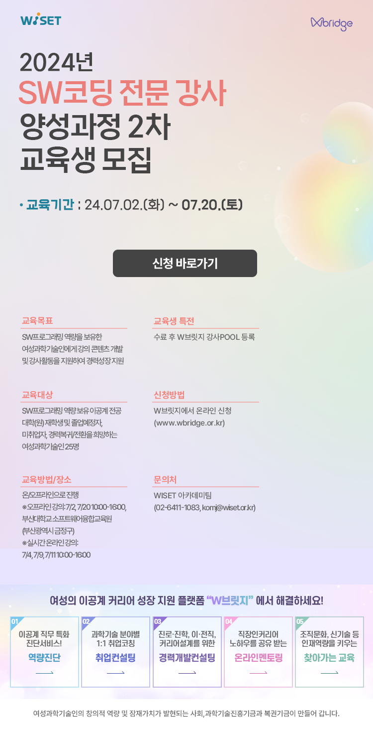 ① 온라인 접수: WISET 홈페이지 공고 및 W브릿지 신청페이지를 통한 접수