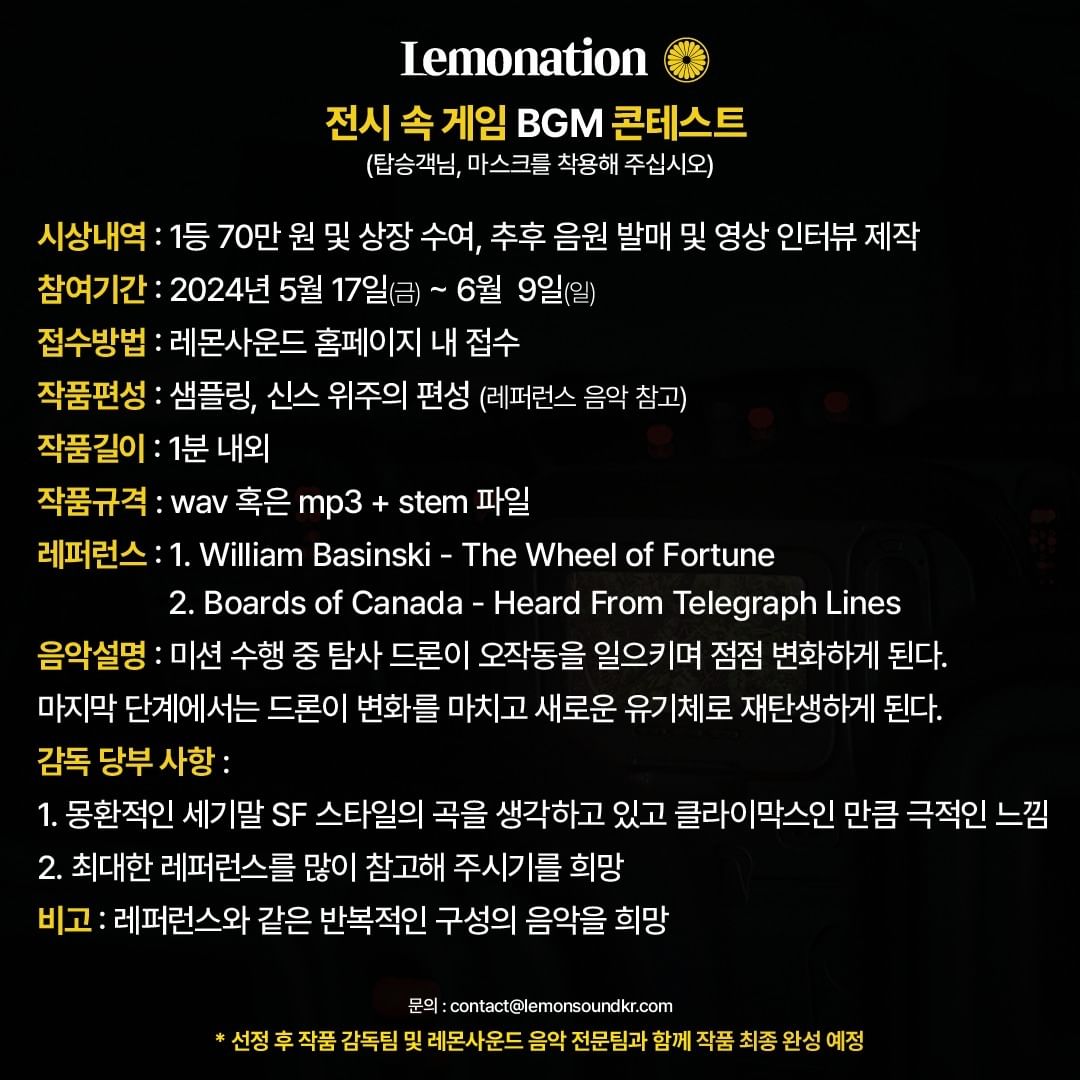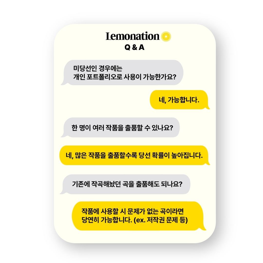 지원 자격: 무관 (개인 및 팀으로 참여 가능, 레몬사운드 홈페이지 가입 후 접수)