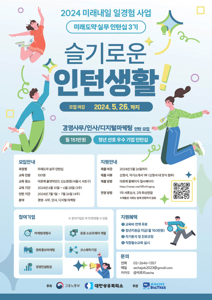 고용노동부 대한상공회의소 주최로 실시하는 “2024 미래내일 일경험 사업 미래도약 실무 인턴십 3기” 참여자를 모집합니다. 인턴십 4주 과정 모집중 !!