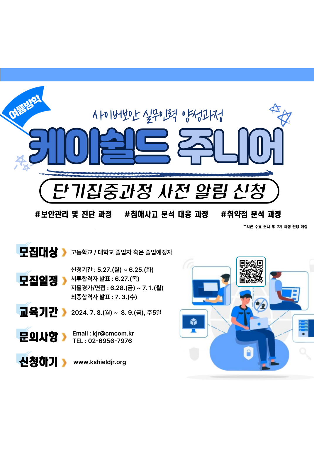 K-Shield Jr. 사이버보안 인력양성은 바로 현장에 투입될 수 있도록 국내 보안 기업이 직접 요구하는 보안 지식과 기술을 직무별로 집중적으로 다루며 각 과정에 맞는 교육 수료후 협력 업체와 연계해 취업을 지원하는 한국인터넷진흥원이 주관하는 사이버보안 교육 과정