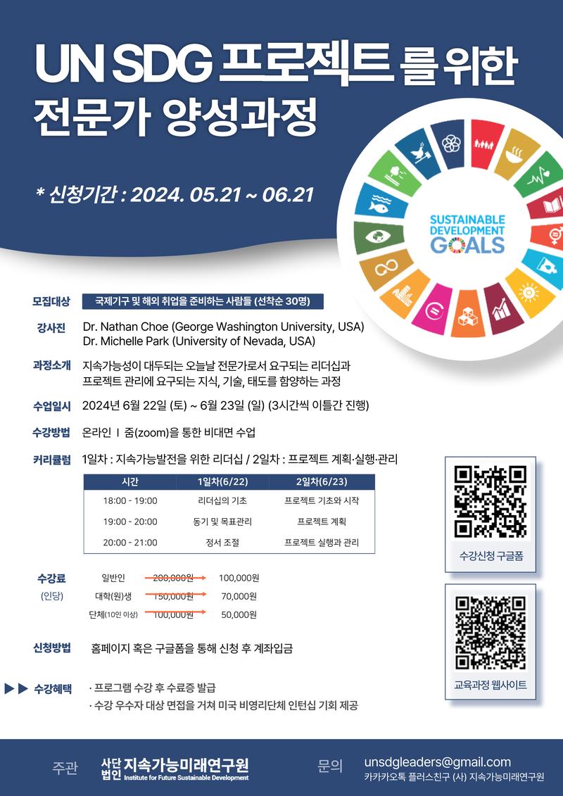 사단법인 지속가능미래연구원에서 <UN SDG 프로젝트를 위한 전문가 양성과정> 수강생을 모집합니다.