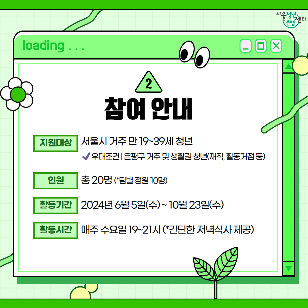 - 서울시 거주 만 19~39세 청년 20명 (*팀별 정원 10명)
