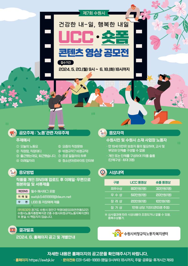 ① 출품자 개인 SNS에 출품작 업로드 - 전체공개 및 필수 해시태그 - #수원비정규센터 #수원시비정규직 #수원시노동공모전 #노동UCC #노동숏폼 #수원시비정규직노동자복지센터 ② 서류제출 - 공모전 응모서류를 자필서명 후 스캔파일로 제출 - 서식 다운로드 : 홈페이지(swbjk.kr) → 센터소식 |
