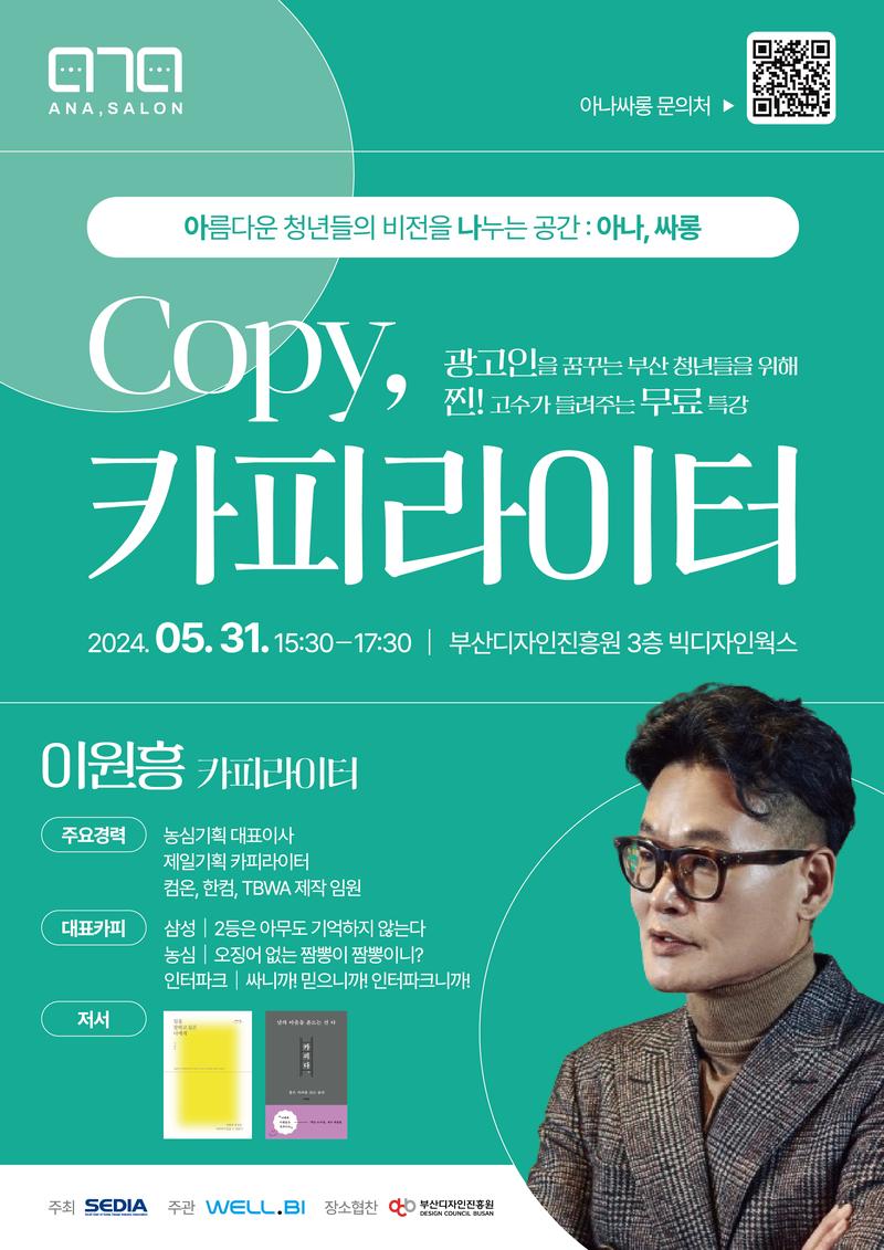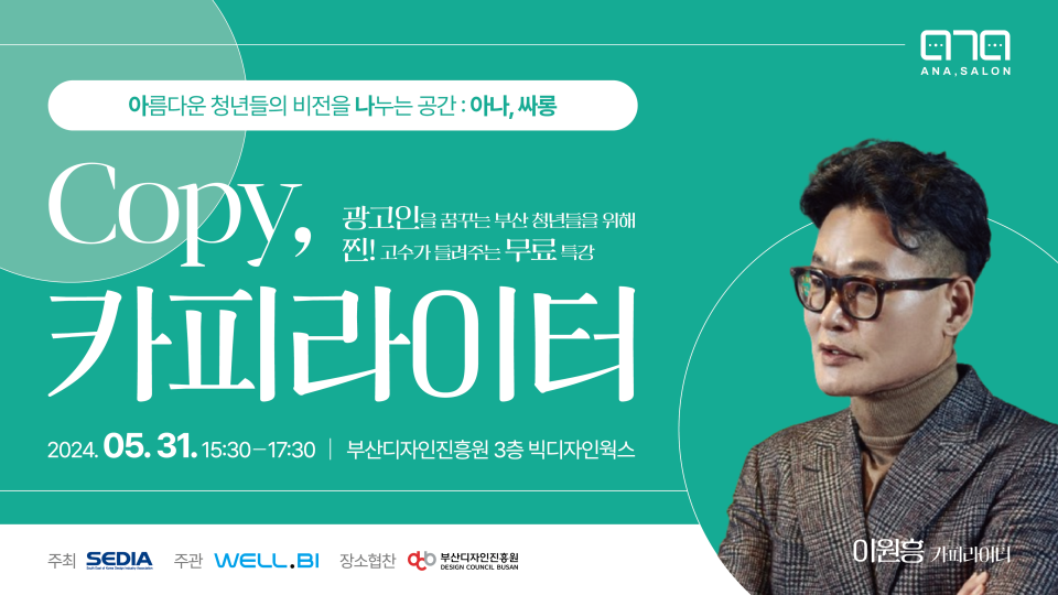 아나,싸롱의 첫번째 특강은 광고인을 꿈꾸는 부산 청년들을 위해 찐! 고수가 들려주는 무료 특강Copy, 카피라이터의 주제로 前 농심기획 대표이사, 前 제일기획 카피라이터