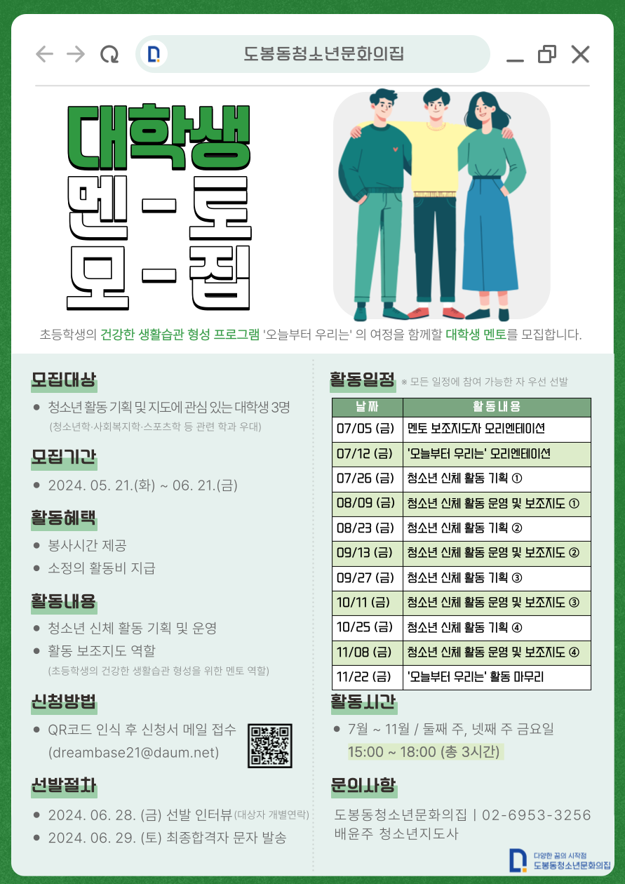 - 청소년 활동 기획 및 운영에 관심이 있는 20세~25세 대학생