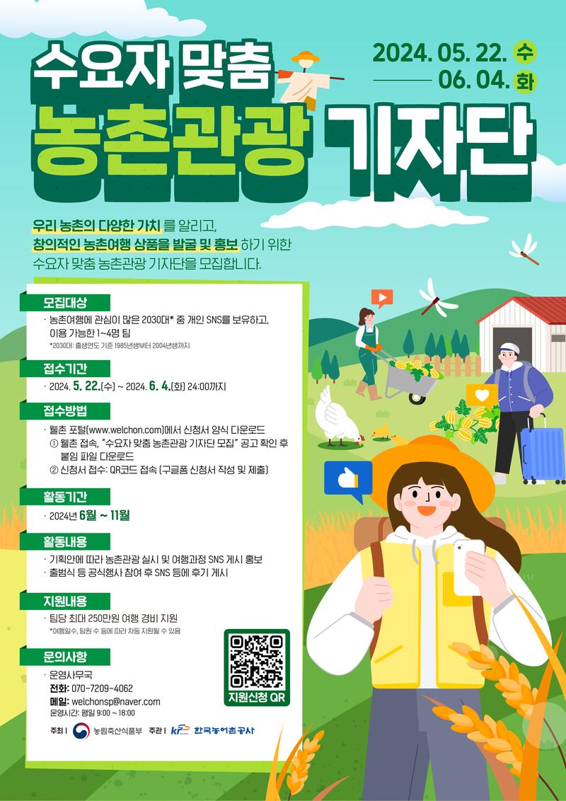 농촌의 다양한 가치를 알리고, 창의적인 농촌여행 상품 발굴 및 홍보를 위한 기자단을 모집합니다!