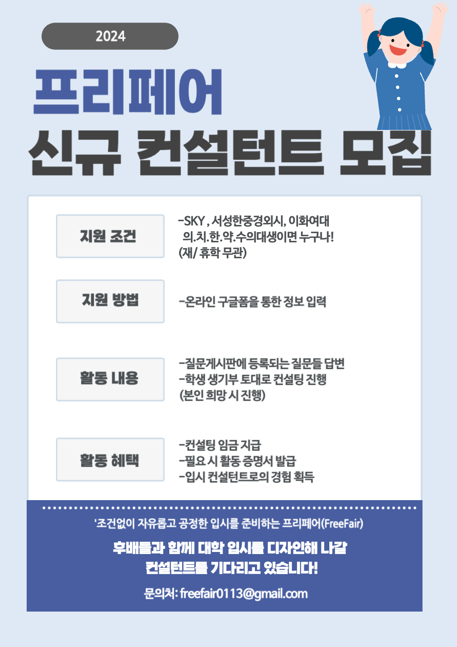 안녕하세요, ‘조건없이 자유롭고(Free) 공정한(Fair) 입시를 준비하는 ‘프리페어’(FreeFair)입니다 !