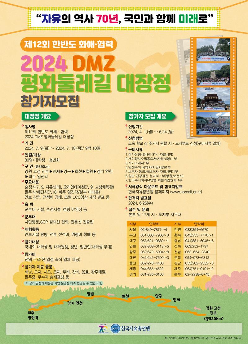 - 전후세대 대학생, 청년을 대상으로 'DMZ 평화둘레길 320Km 구간 도보' 대장정을 통해 분단현실 자각 및 올바른 안보정신 확립