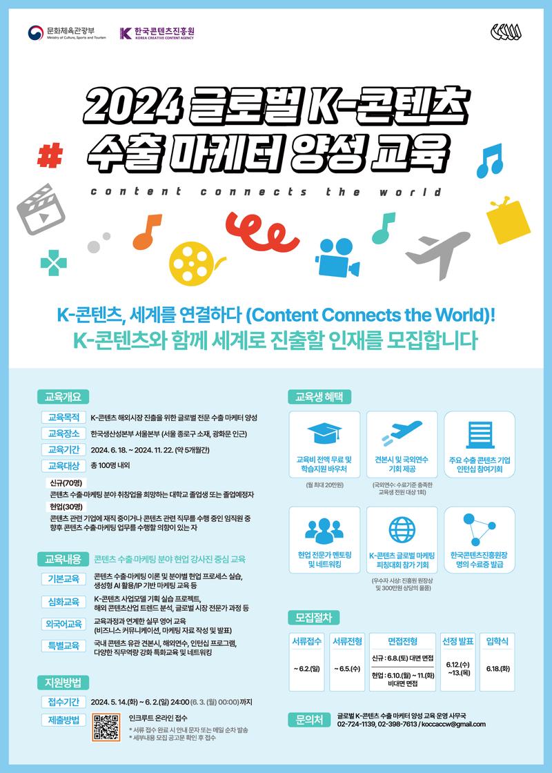 문화체육관광부와 한국콘텐츠진흥원은 'K-콘텐츠, 세계를 연결하다 (Content Connects the World, CCW)'라는 의미를 담아, K-콘텐츠의 지속적인 해외진출을 지원하기 위해 「2024 글로벌 K-콘텐츠 수출 마케터 양성 교육」을 추진하고 있습니다.