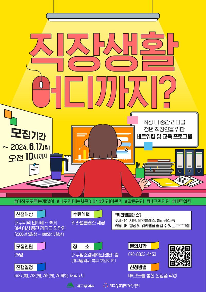 대구광역시와 (재)대구창조경제혁신센터에서는 직장 내 중간 리더급 청년 직장인을 대상으로 상황에 맞는 맞춤형 프로그램을 운영하여 청년들의 역량 강화를 지원하는 [직장생활 어디까지 1기] 참여자를 모집 합니다.😄