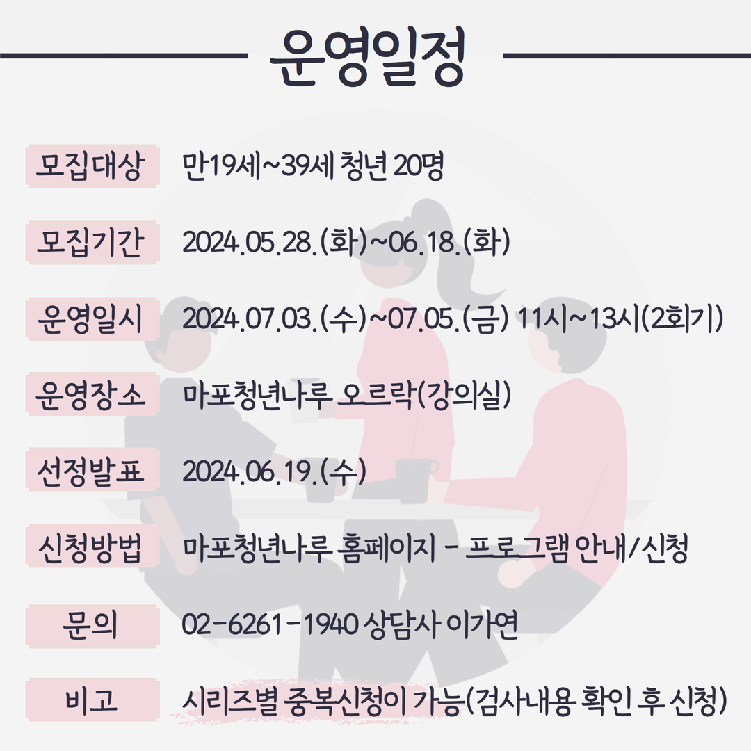 ◎ 신청방법: 마포청년나루 홈페이지 – 프로그램 안내/신청