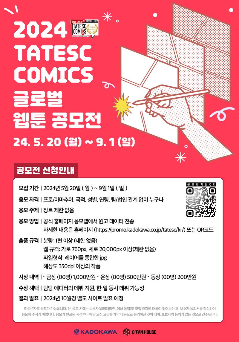- 오팬하우스/KADOKAWA가 필요하다고 판단하는 경우, 응모자의 동의 없이 본 모집 요강 변경 가능. 또한 본 모집 요강을 변경하는 경우, 오팬하우스/KADOKAWA는 그 변경 시기 및 내용을 <The 2nd TATESC COMICS Global Awards> 사이트 홈페이지에 게재하거나 응모자에게 통지할 예정