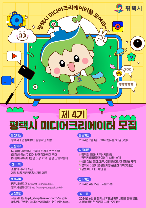 평택시 미디어크리에이터를 모집합니다. 평택의 문화/지역/여행/사람 등 평택에 대한 다양하고 따뜻한 이야기를 담아주실 여러분의 많은 참여를 기다립니다.