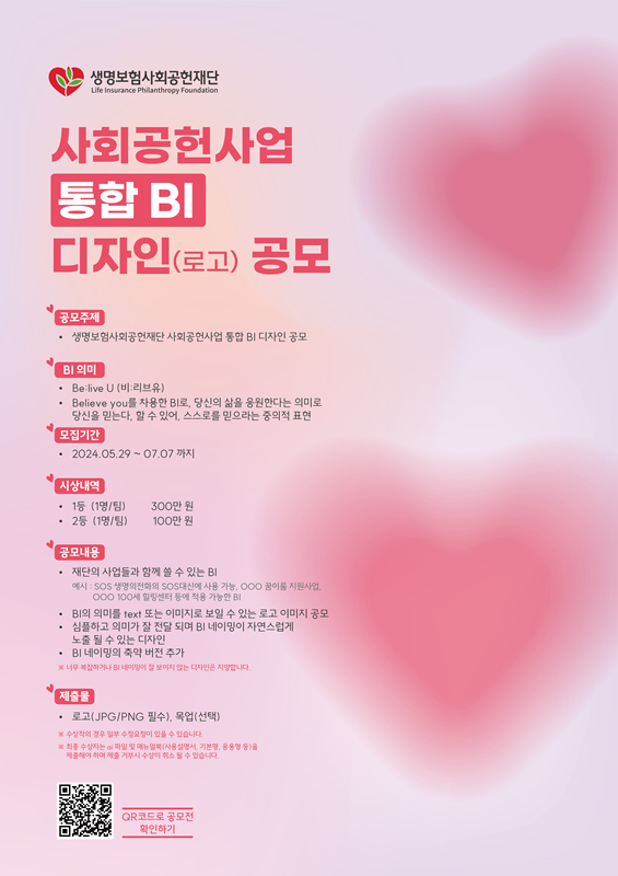 - 재단의 사업들과 함께 쓸수 있는 BI 였으면 합니다. (예시 :SOS 생명의전화의 SOS대신에 사용 가능하고, OOO 꿈이룸 지원사업, OOO 100세 힐링센터 등에 적용 가능한 BI)