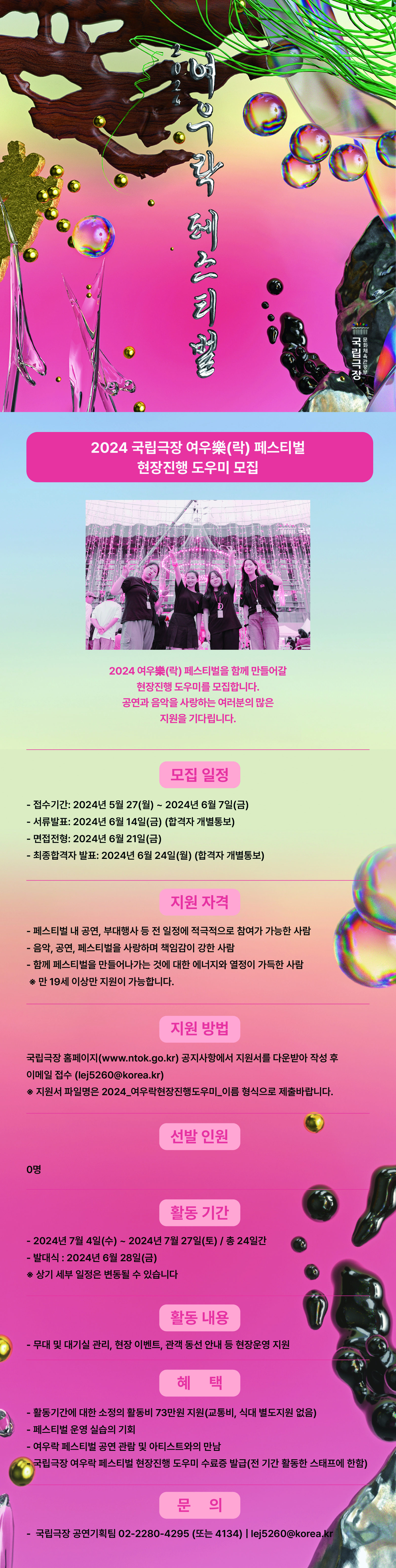 - 국립극장 여우락 페스티벌 현장진행 도우미 수료증 발급(전 기간 활동한 스태프에 한함)