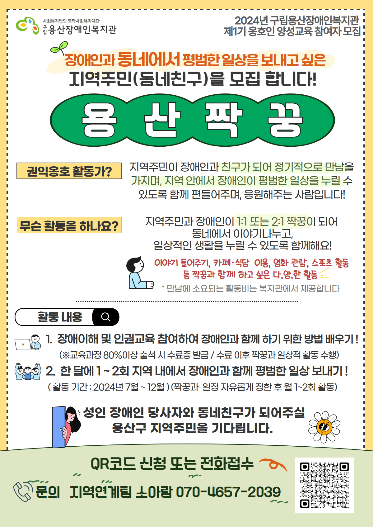 ✔️ 모집대상: 용산구 및 인근지역에서 장애주민의 이웃(동네친구)가 되어주실 성인 비장애 지역주민