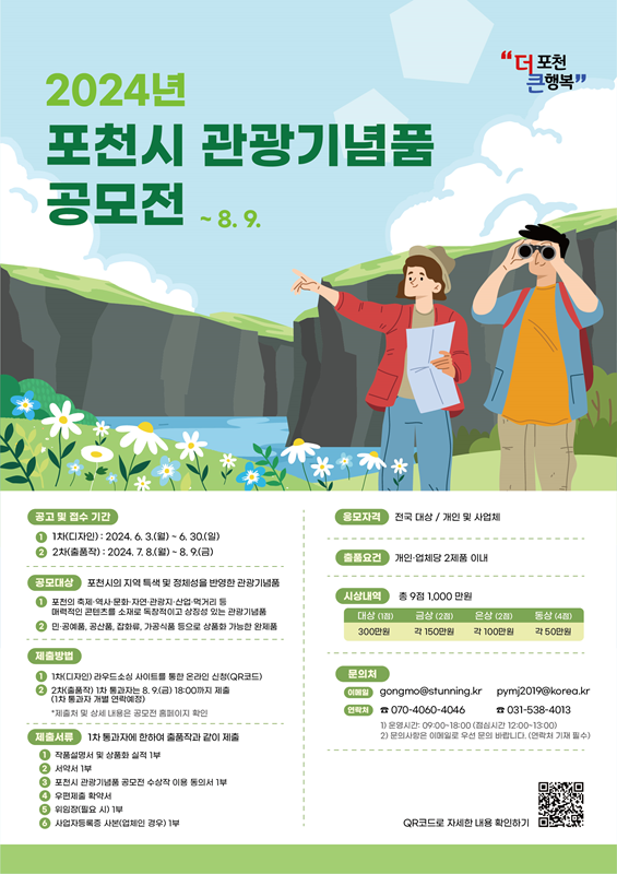 포천시의 고유한 지역 특성과 정체성을 반영한 관광기념품을 발굴 및 육성하고자 「2024년 포천시 관광기념품 공모전」을 아래와 같이 공고하오니, 관심 있는 분들의 많은 참여 바랍니다.