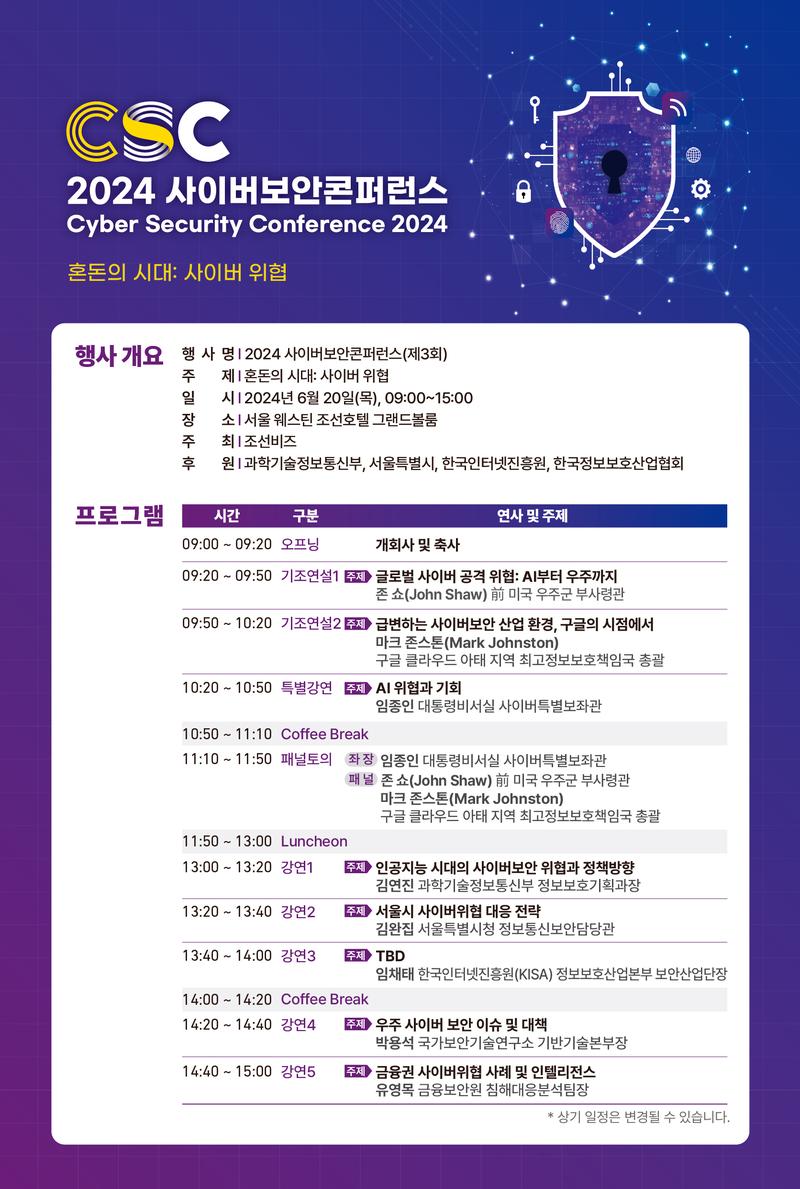 하단에 2024 사이버보안콘퍼런스 행사 개요 및 프로그램 시간표 자료 공유해드리니 참고부탁드립니다. - - - - - - - - - - - - - - - - - -