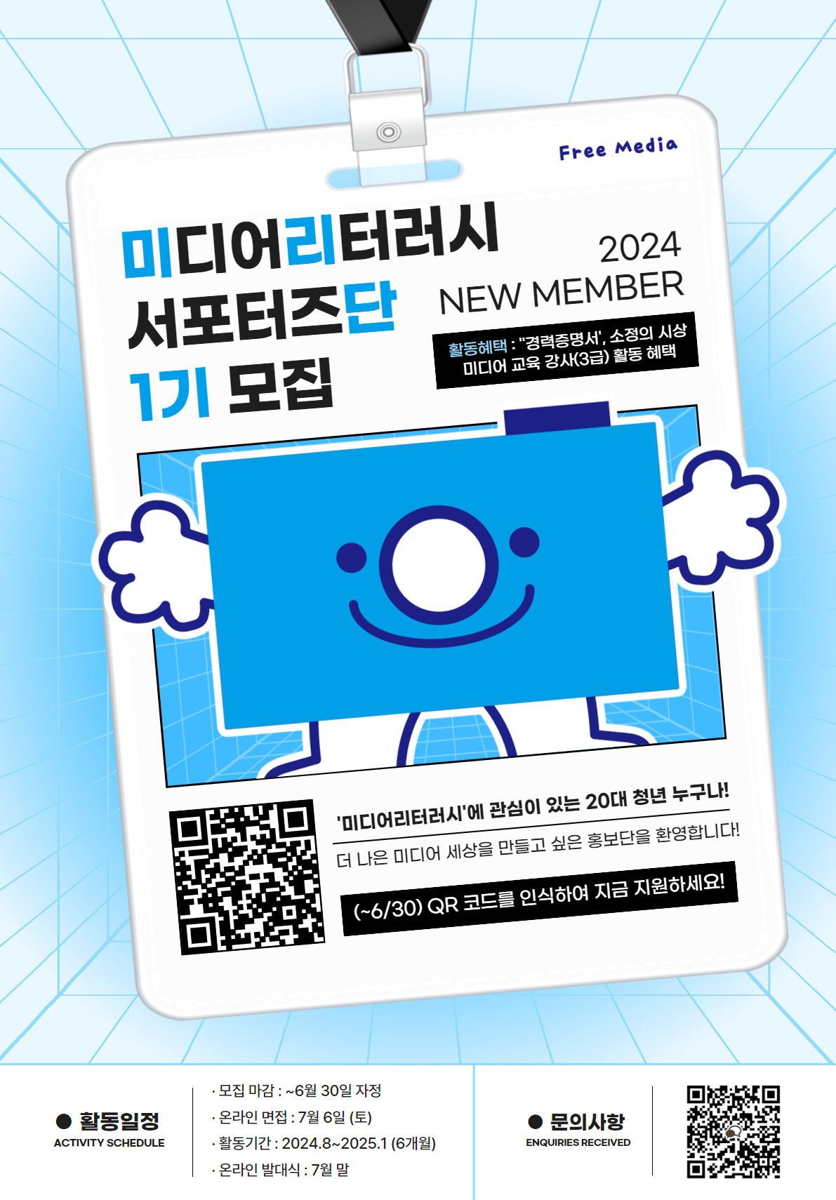 안녕하세요, 미디어 교육 회사 '프리미디어'에서 주관하는 대한민국 청년 '미디어리터러시' 서포터즈단 '미리단'은 더 나은 미디어 세상을 위해, 올바른 미디어 문화를 쉽고 재밌게 알리는 청년 홍보단입니다. 많은 지원 부탁드립니다!