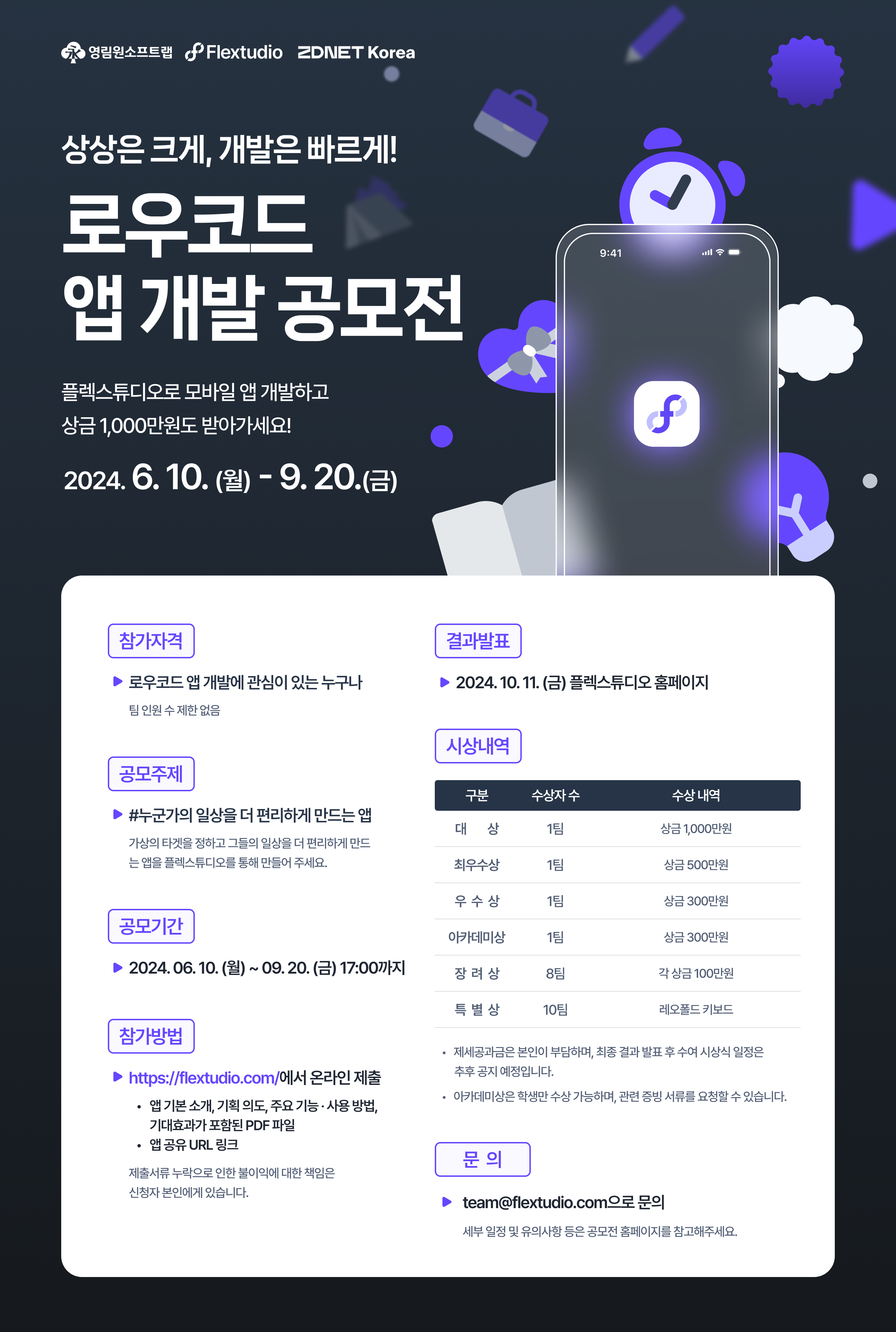 일상의 불편을 해소하고 더 편리한 세상을 만들기 위해 로우코드 앱 개발 공모전을 개최합니다. 로우코드 앱 개발 플랫폼 <플렉스튜디오>로 모바일 앱 개발하고 상금 1,000만원도 받아가세요!