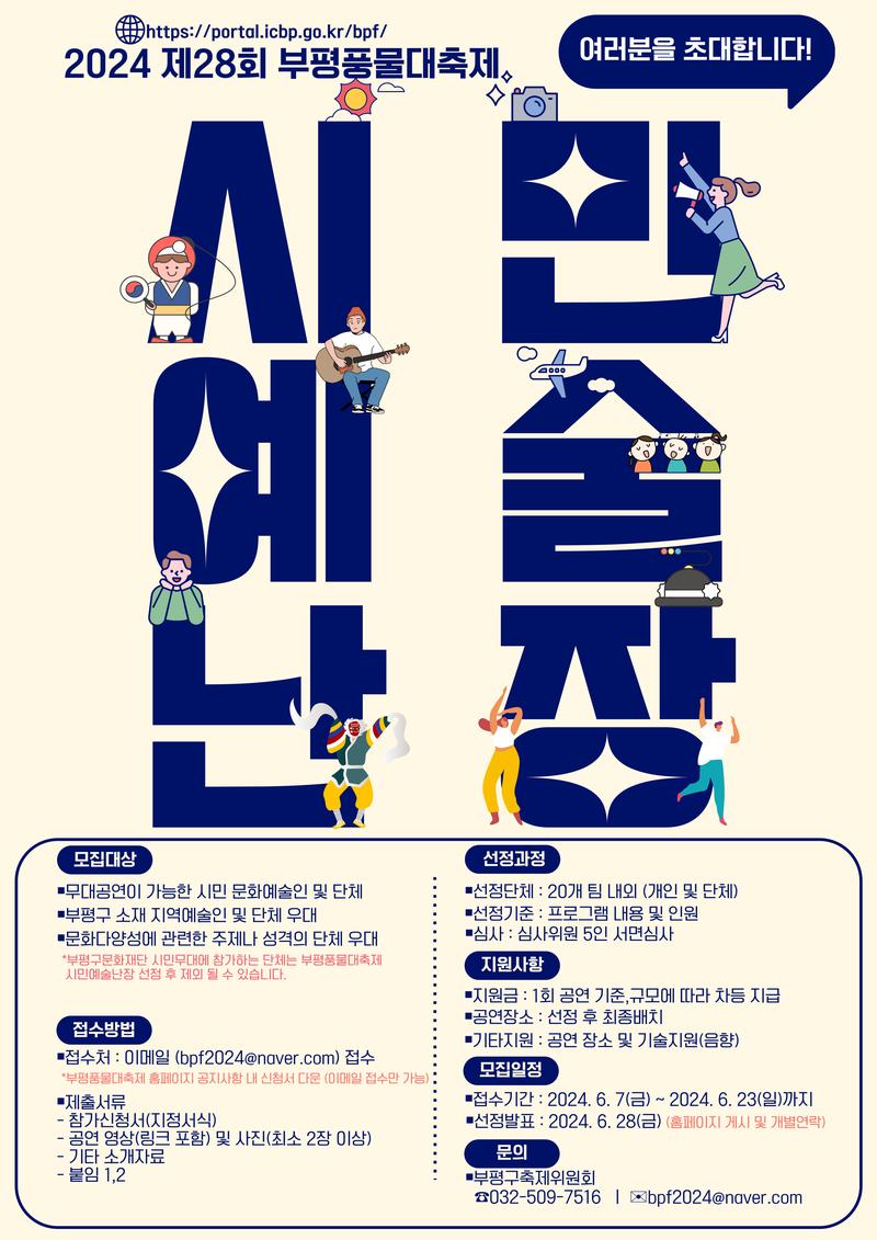 인천광역시 부평구에서 주최하고 부평구축제위원회·부평구문화재단·부평문화원에서 주관하는 2024 제28회 부평풍물대축제에서는 「시민예술난장」 무대에 함께해주실 참여단체를 아래와 같이 공개모집 하고자 합니다.