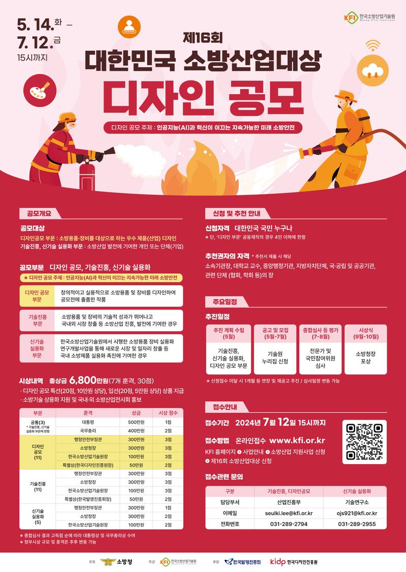 - 접수처 : 홈페이지(https://www.kfi.or.kr) → 사업안내 → 소방산업 지원사업 신청 → 제16회 소방산업대상 신청