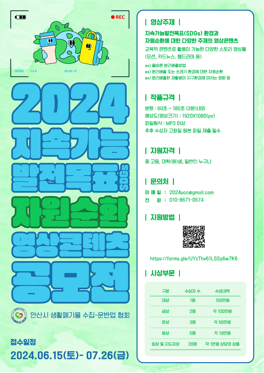 환경과 자원순환에 대한 이해와 소통을 위한 2024년 지속가능발전목표(SDGs) 「자원순환 영상 콘텐츠 공모전」을 개최하오니, 관심있는 분들의 적극적인 참여를 바랍니다.