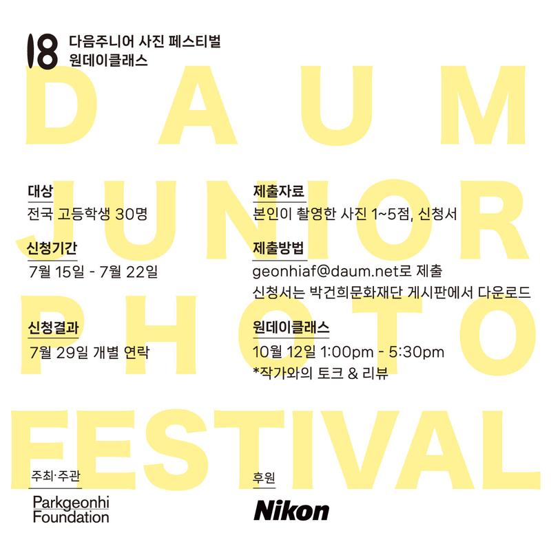 다음주니어 사진 페스티벌은 청소년의 잠재적 재능을 지원하는 사진문화 교육 프로그램입니다. 2020년부터는 원데이 클래스 형태로 사진에 관심있는 고등학생을 대상으로 진행합니다. 소수로 진행되는 원데이 클래스는 1명의 사진가가 진행하며 작가와의 토크, 리뷰, 야외촬영 프로그램으로 구성되어있습니다. 원데이클래스 참여작 중 우수작은 부산국제사진제 청소년전 초대의 기회가 제공되고 그 중 1인의 학생에게는 다음주니어 상을 시상합니다.