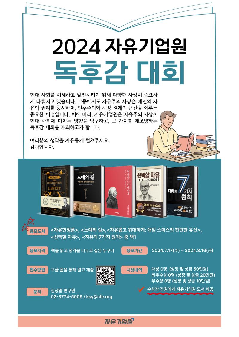 ■ 응모도서: <자유헌정론>, <노예의 길>, <자유롭고 위대하게: 애덤 스미스의 찬란한 유산>, <선택할 자유 >, <자유의 7가지 원칙> 중 택1