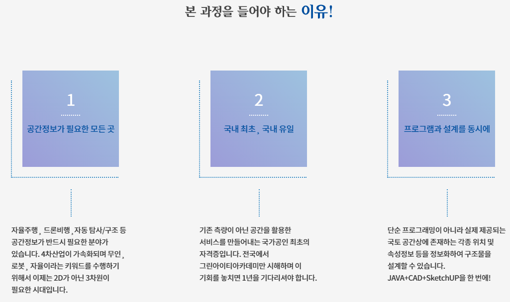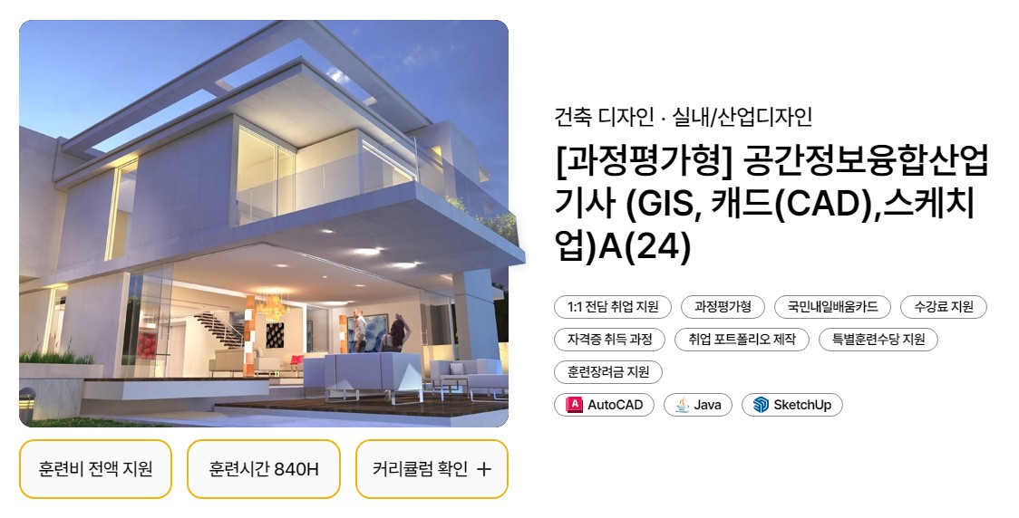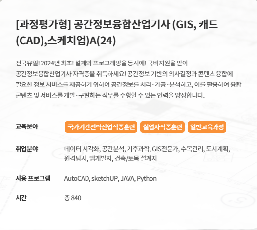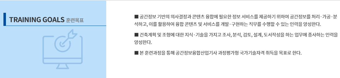 ■ 본 훈련과정을 통해 공간정보융합산업기사 과정평가형 국가기술자격 취득을 목표로 한다.