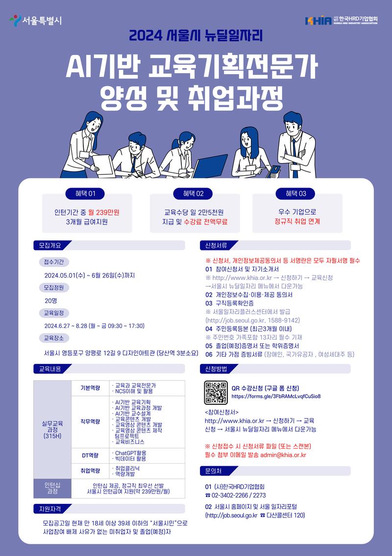 서울시에 거주하는 청년구직자를 대상으로 직무교육과 인턴근무 및 급여를 지원함으로써 실무경험을 토대로 안정적인 취업의 기회를 제공하는 「서울시 뉴딜일자리 ‘AI기반 교육기획전문가 양성 및 취업과정’」 참여자를 아래와 같이 모집합니다.