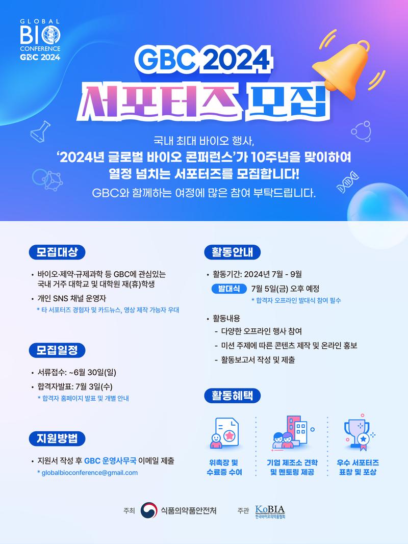 국내 최대 K-바이오 국제 행사, ‘2024년 글로벌 바이오 콘퍼런스’에서 열정 가득한 서포터즈를 모집합니다.