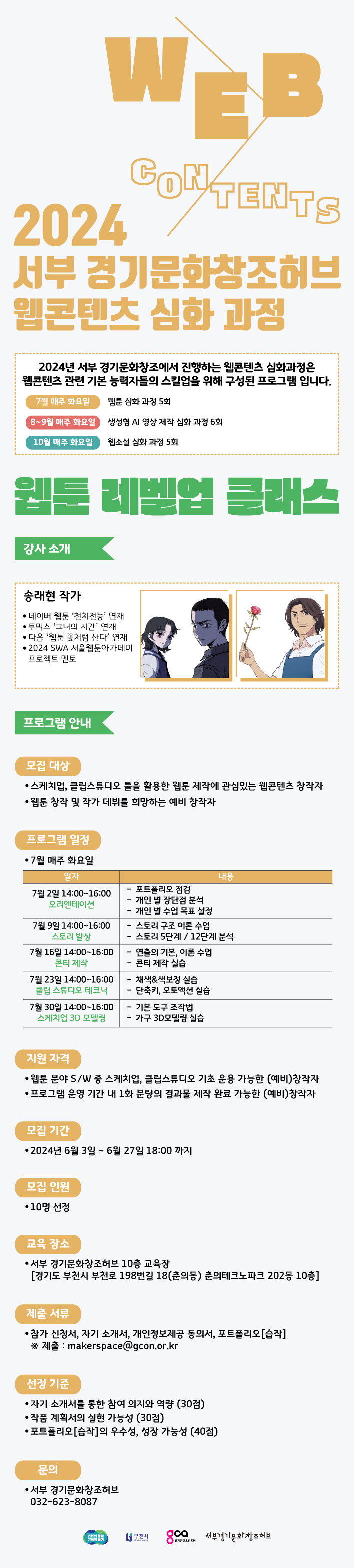Ο 지원자격 : 웹툰 분야 S/W 중 스케치업, 클립스튜디오 기초 운용 가능한 (예비)창작자, 프로그램 운영 기간 내 1화 분량의 결과물 제작 완료 가능한 (예비)창작자