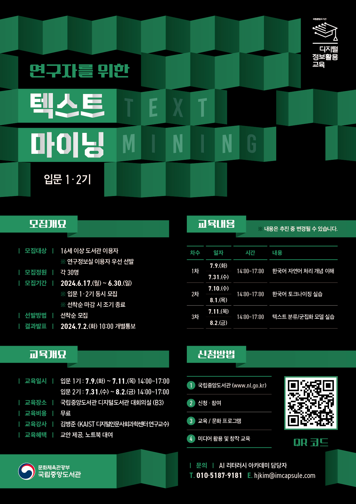 국립중앙도서관에서 디지털 정보 활용 교육 「연구자를 위한 텍스트 마이닝」교육 과정을 운영합니다. 텍스트 데이터 분석 역량을 강화하여 연구에 새로운 시사점을 얻고자 하는 연구자 분들의 많은 참여 바랍니다.