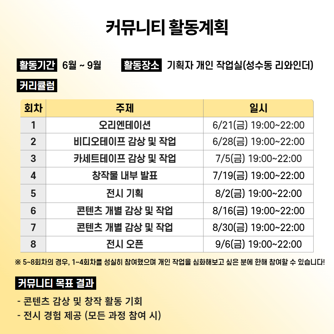 - 운영 장소 : 기획자 작업실(성수동 리와인더)