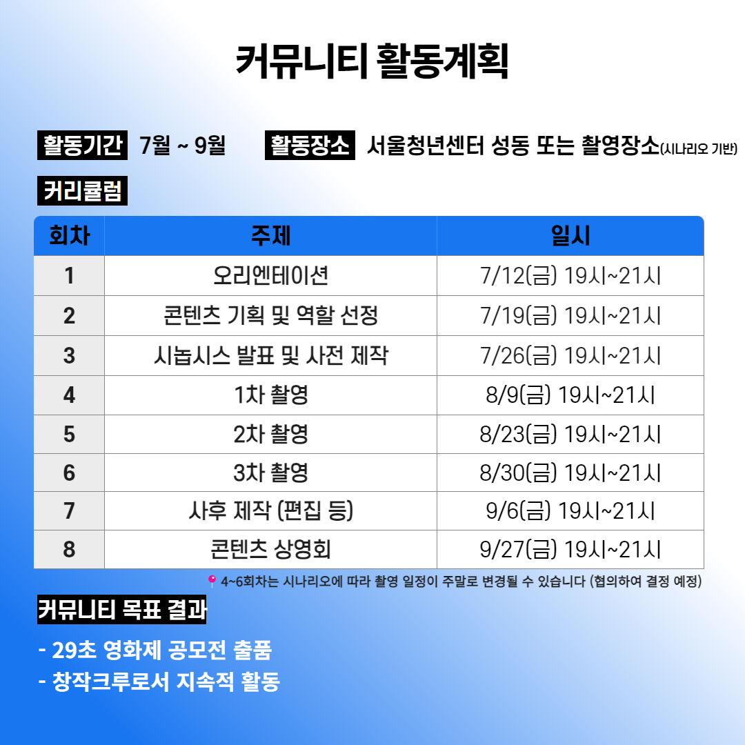 - 운영 장소 : 서울청년센터 성동 또는 촬영장소(시나리오 기반)