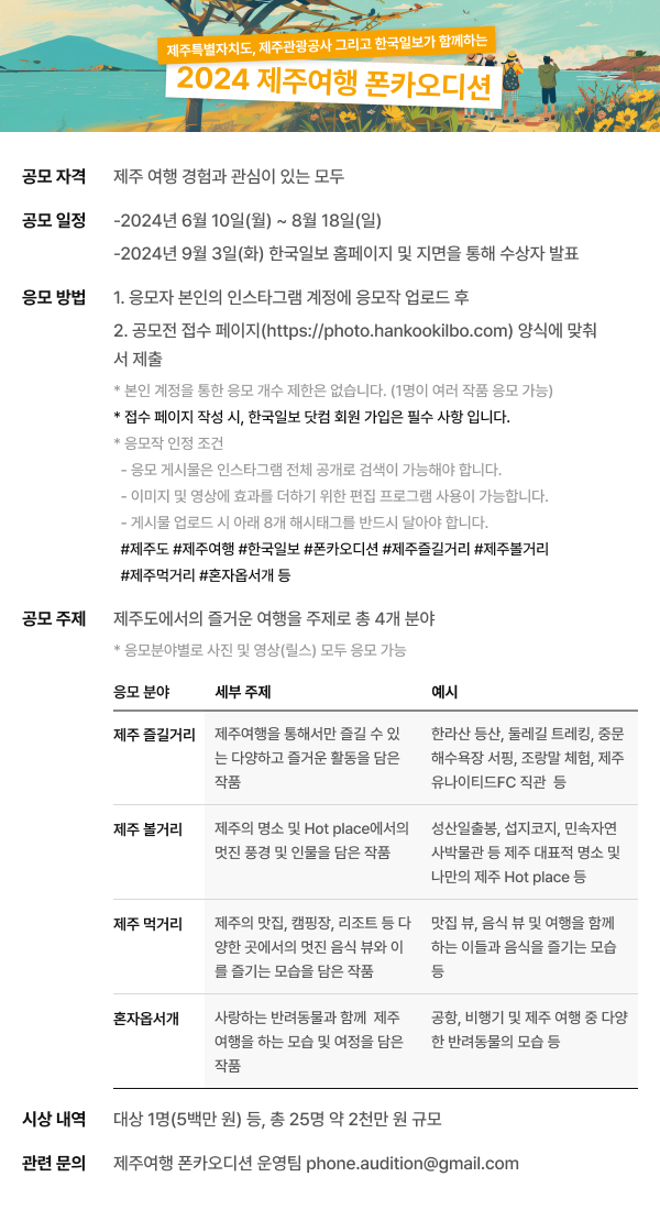 : 제주도에서의 즐거운 여행을 주제로 총 4개 응모 분야가 있습니다.