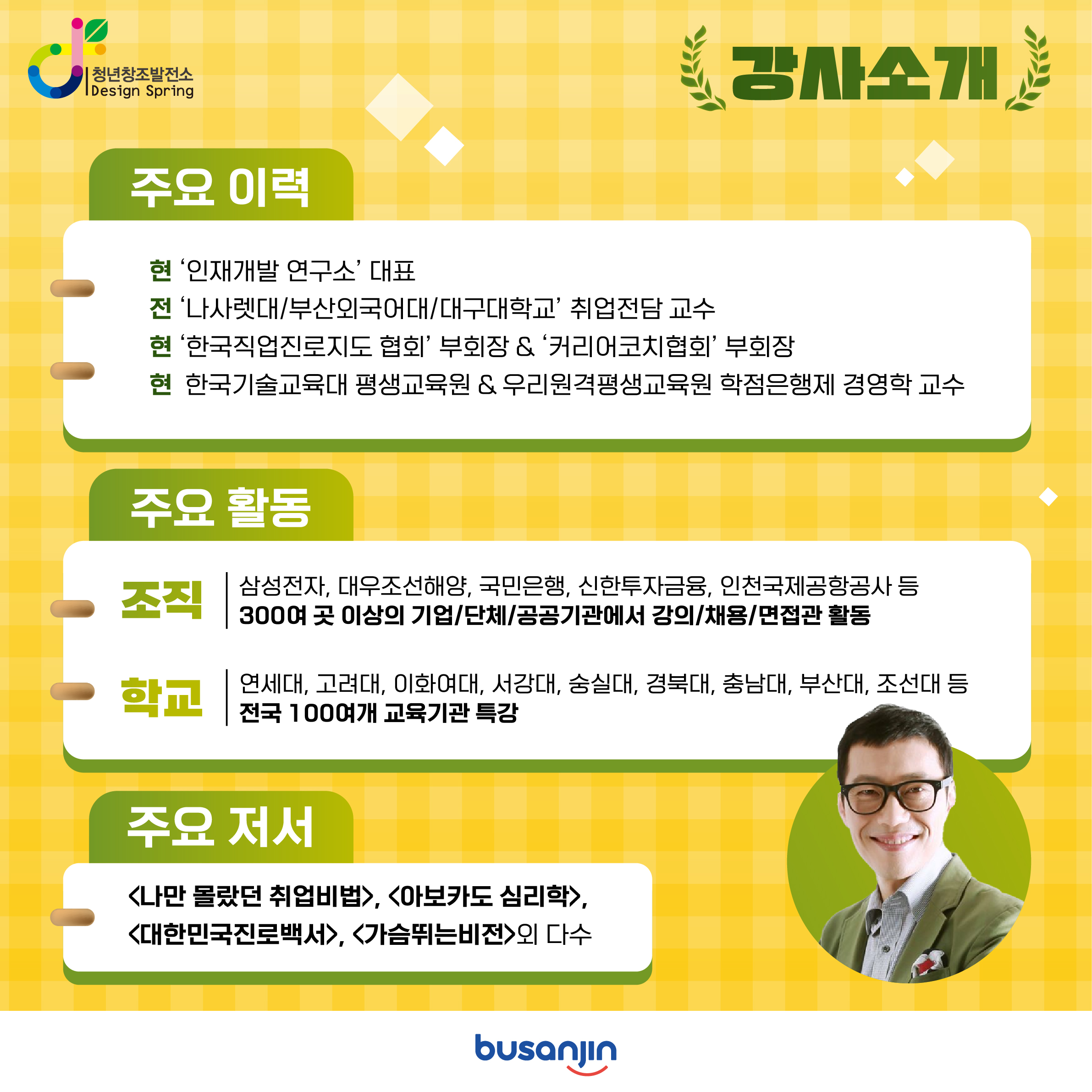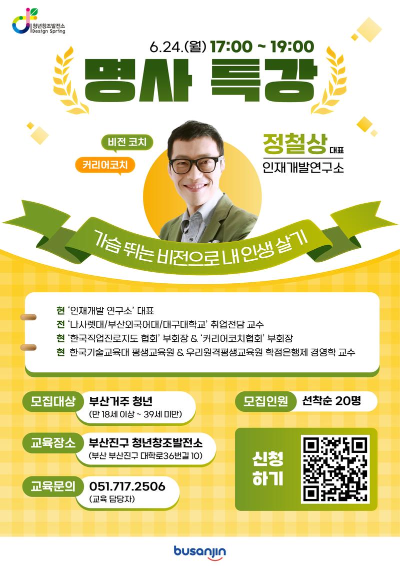 부산진구 청년창조발전소에서 명사특강(가슴 뛰는 비전으로 내 인생 살기) 교육 참가자를 모집합니다.