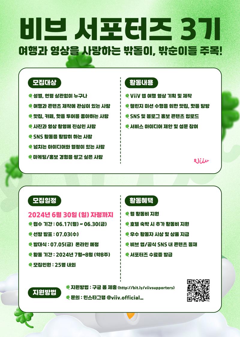 비브(ViiV)는 AI 여행 큐레이션부터 호텔 예약, 영상 자동 편집까지 가능한 여행 올인원 앱입니다. 비브 앱 콘텐츠를 직접! 기획하고 제작하는 값진 경험, 비브 서포터즈에서 얻을 수 있습니다. 많은 관심과 지원 부탁드립니다!