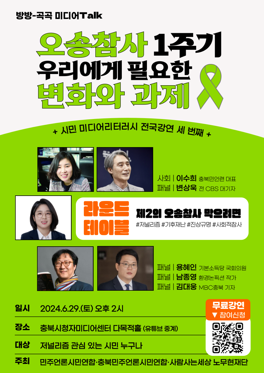 <오송참사 1주기, 우리에게 필요한 변화와 과제>는 6월 29일(토) 오후 2시 충북시청자미디어센터 다목적홀에서 진행됩니다. 민언련・충북민언련・사람사는세상노무현재단이 공동주최하는 이번 강연은 라운드테이블 형식으로 진행되며, 오송참사 유가족 인사말로 시작됩니다. 이어지는 토크에서는 오송참사를 일선에서 취재한 언론인, 기후위기 전문가, 국회의원 등이 모여 제2의 오송참사를 막기 위해 우리사회에 필요한 변화를 짚어봅니다. 이수희 충북민언련 상임대표가 사회를 맡습니다.