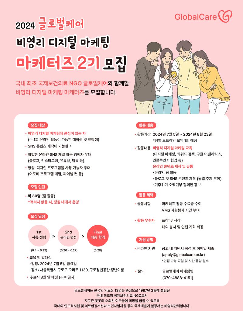 '모두가 건강한 세상(Health for All)'을 꿈꾸는 글로벌케어와 함께할 마케터즈 2기를 모집합니다.