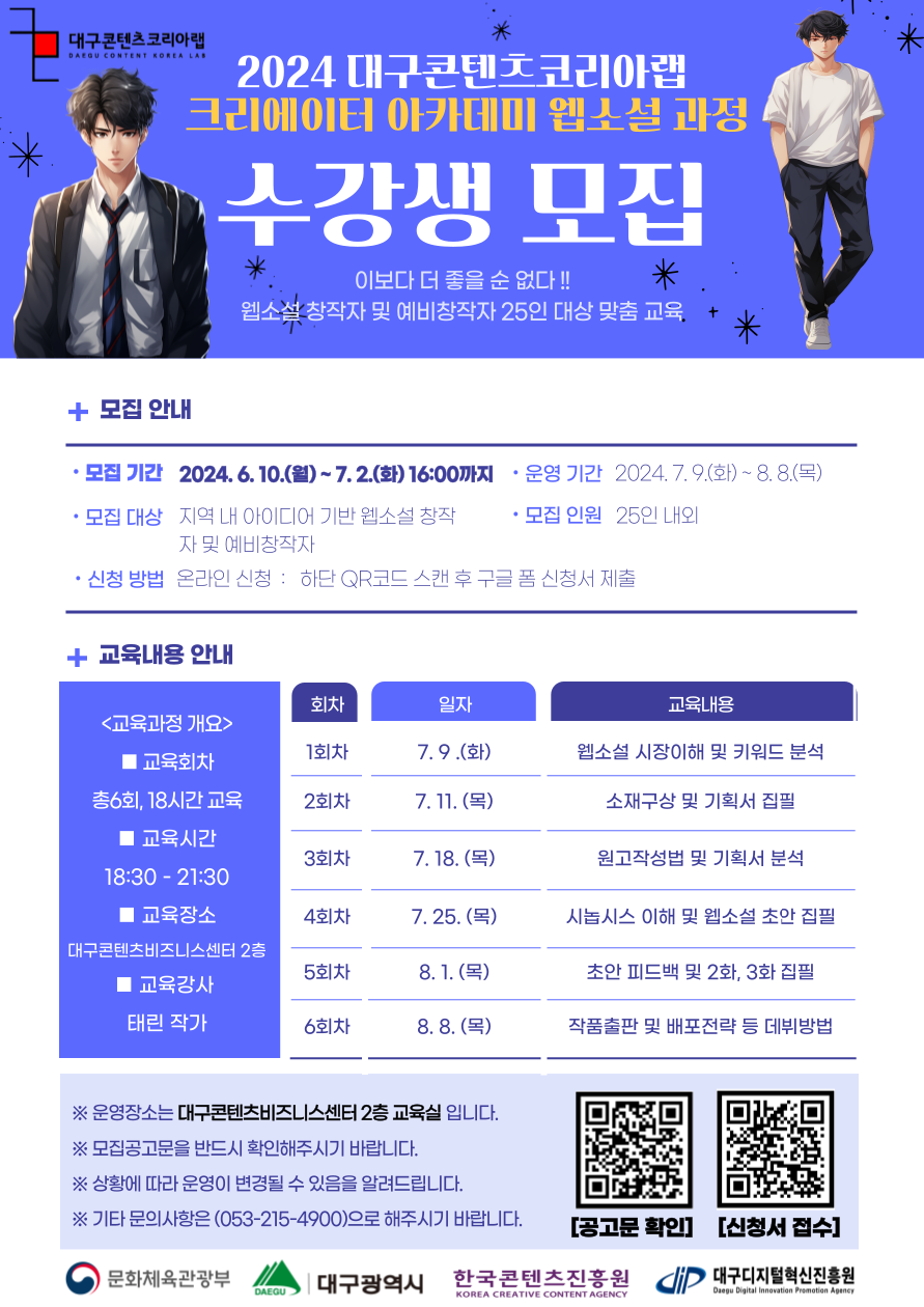 ⭐2024년 대구콘텐츠코리아랩 크리에이터 아카데미 웹소설 과정 참가자 모집⭐